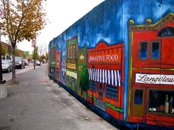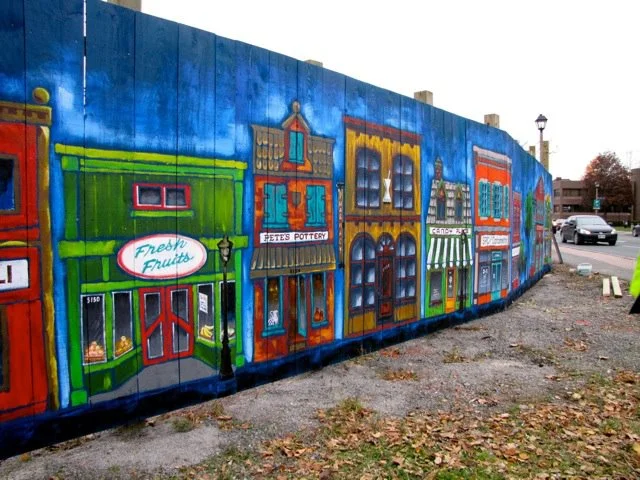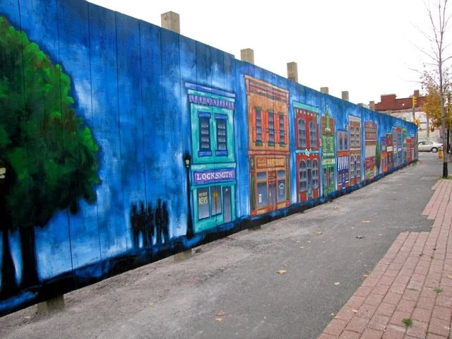 The mural features a streetscape of colourful store facades, and it will be removed once the Dominion Place project is completed.